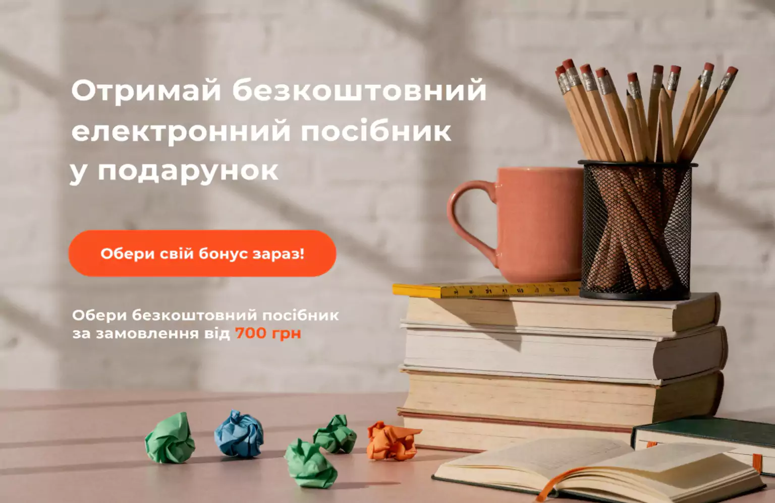 На сторінці оформлення замовлення ви зможете самостійно обрати один із наших найкорисніших матеріалів, і він автоматично додасться до вашого замовлення безкоштовно.